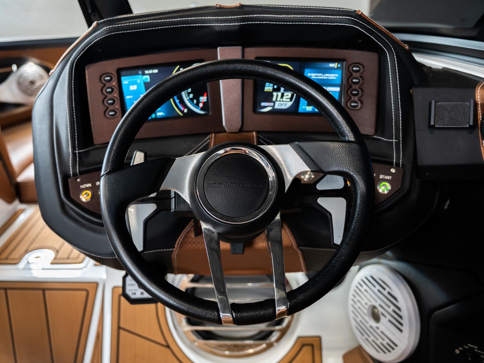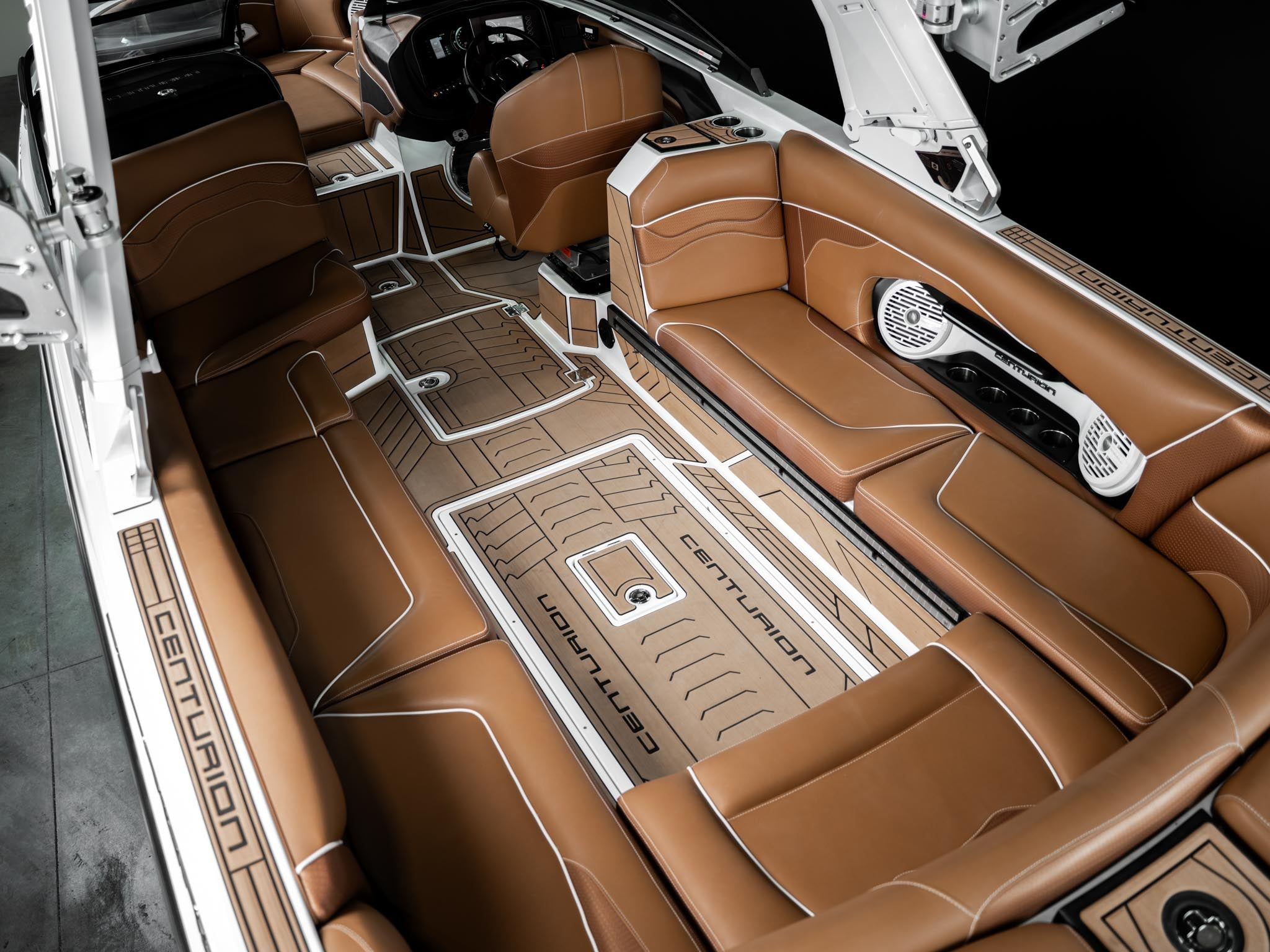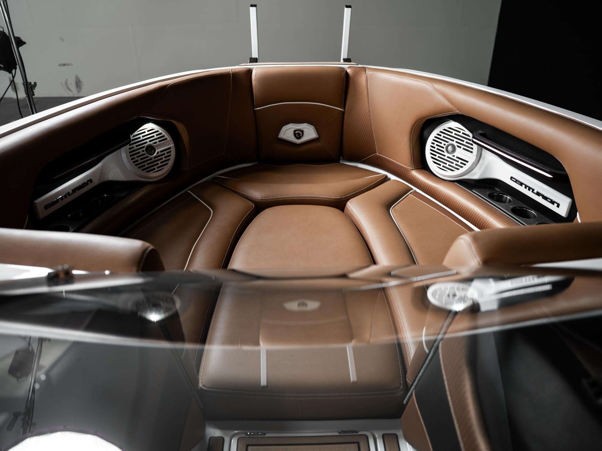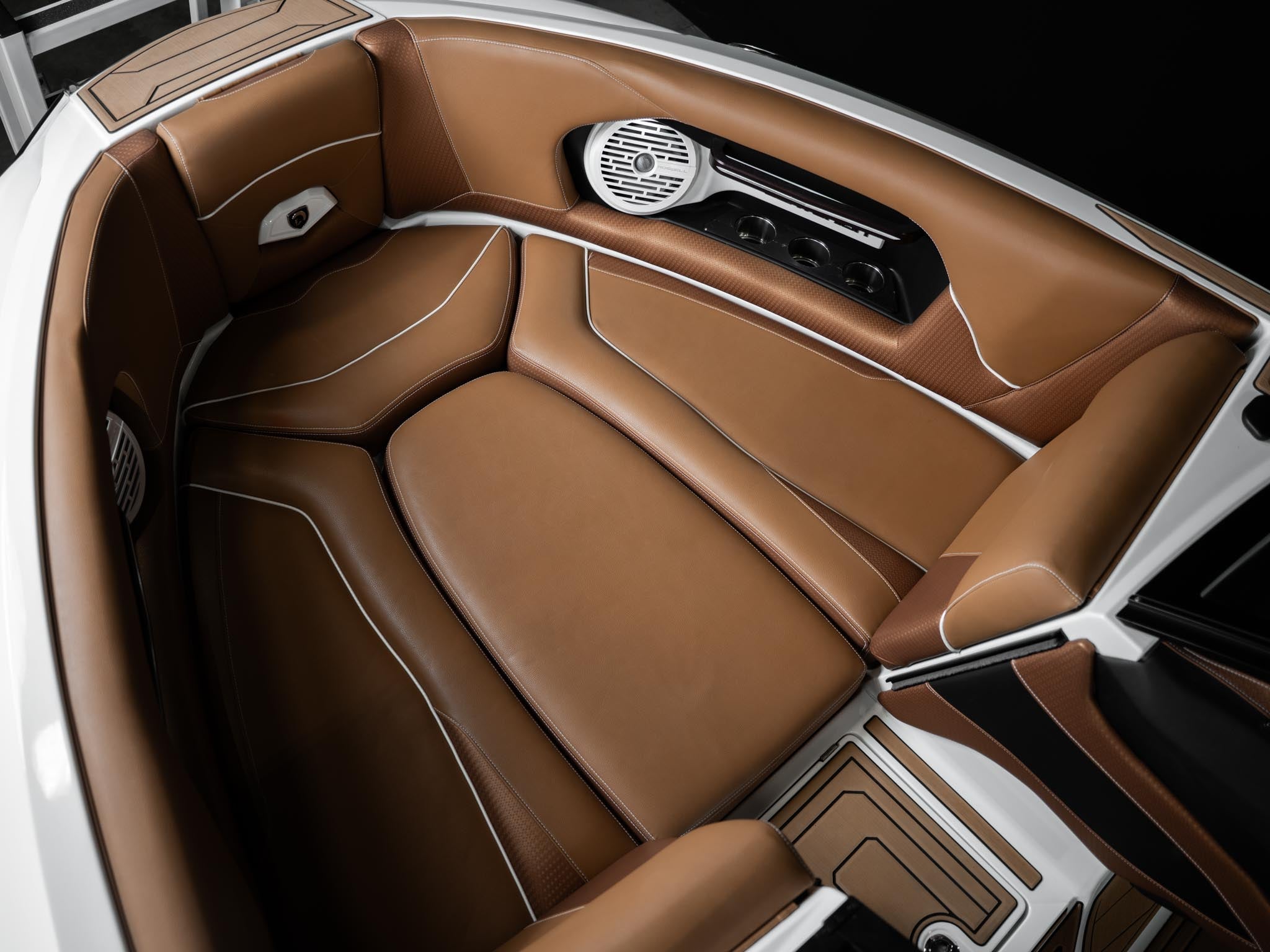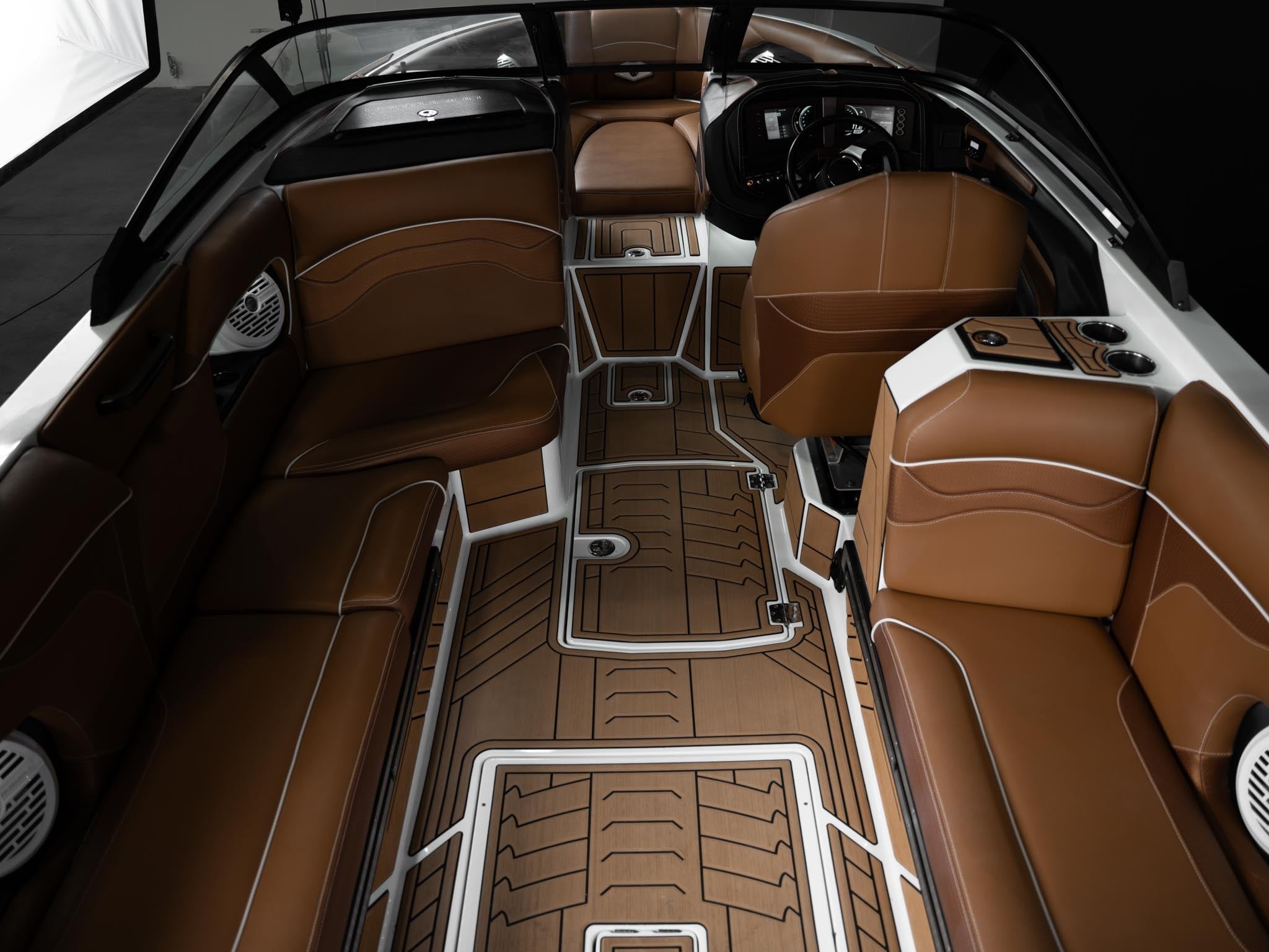 Inside, the Castano interior is a showstopper. Warm, premium brown tones with diamond stitching, embroidered panels, and high-end flooring give the boat a luxury automotive feel. The layout is deep, spacious, and designed to handle large crews without ever feeling crowded. Dual screens, premium audio, and high-end lighting make it feel modern and refined.