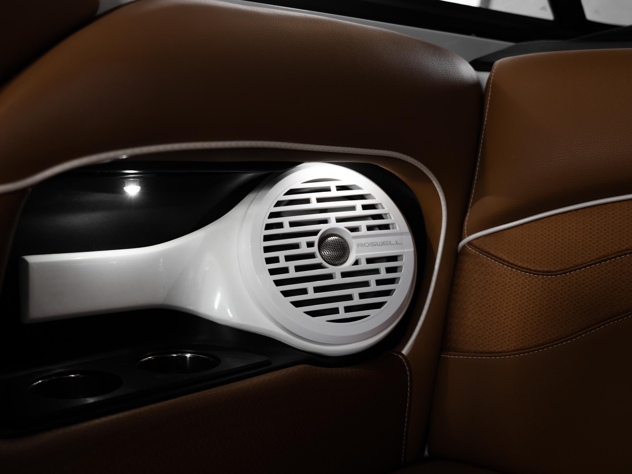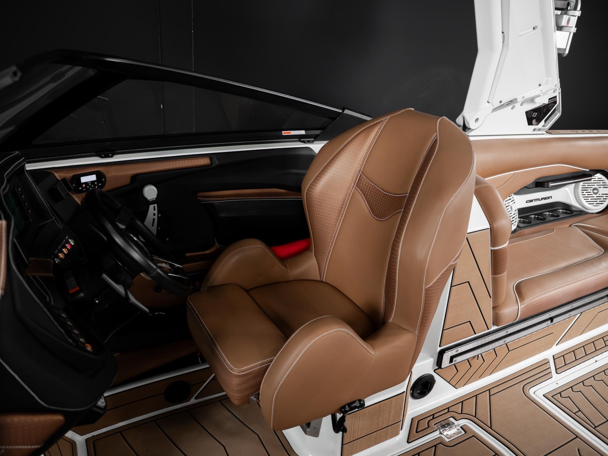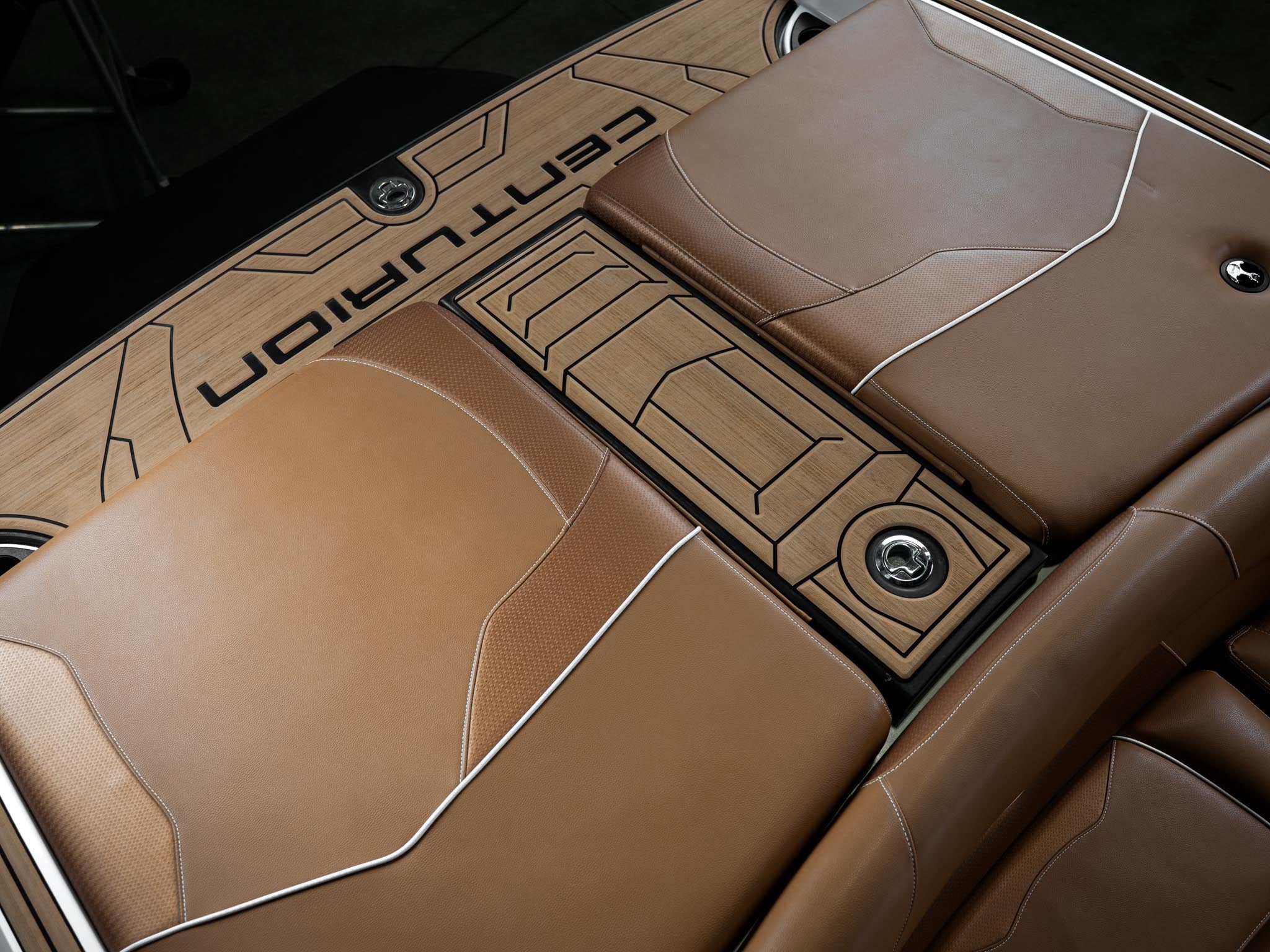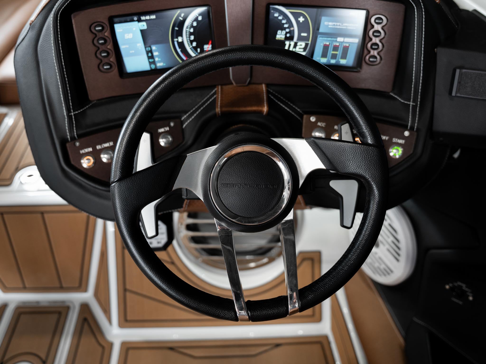 Inside, the Castano interior is a showstopper. Warm, premium brown tones with diamond stitching, embroidered panels, and high-end flooring give the boat a luxury automotive feel. The layout is deep, spacious, and designed to handle large crews without ever feeling crowded. Dual screens, premium audio, and high-end lighting make it feel modern and refined.