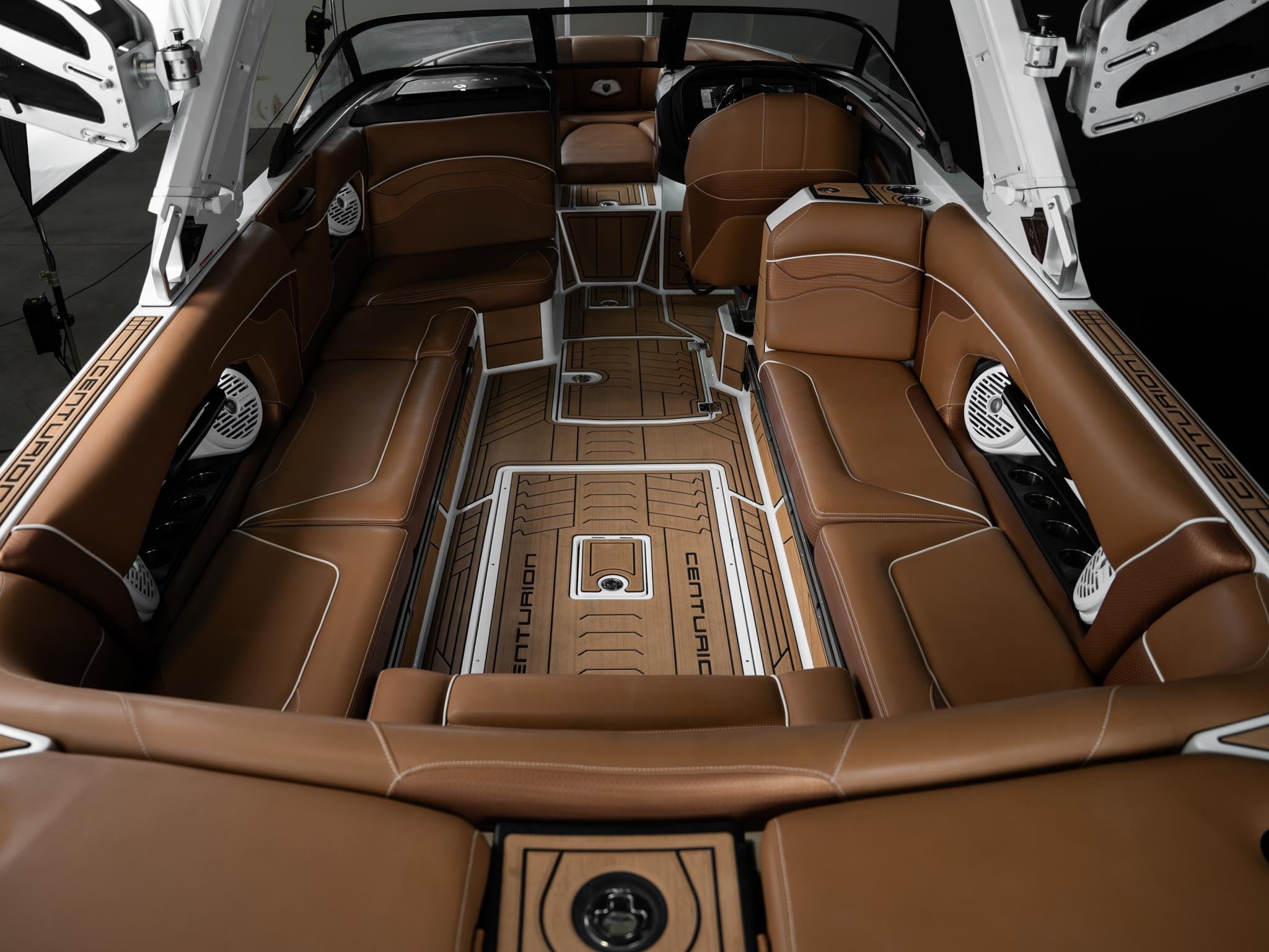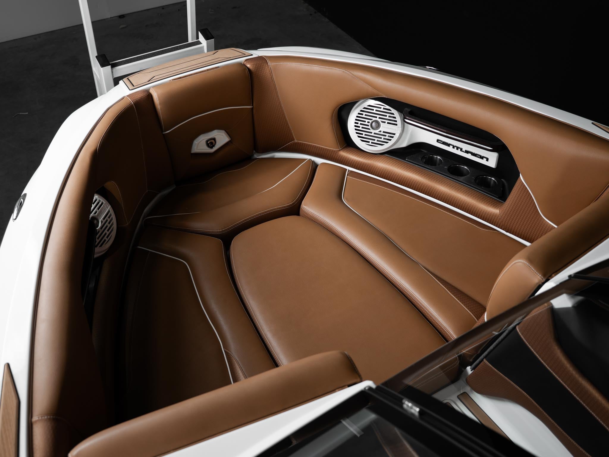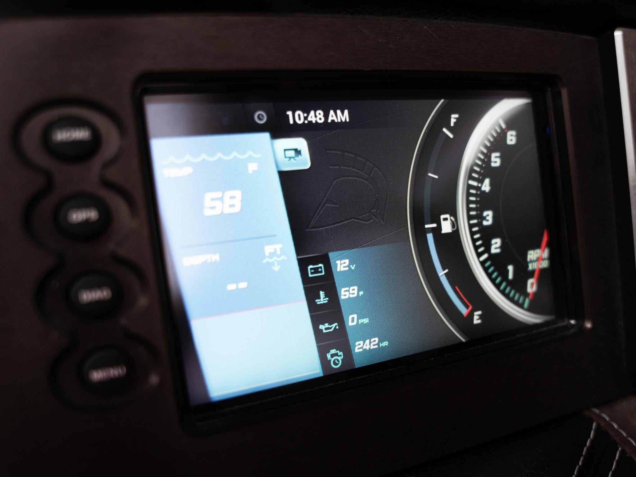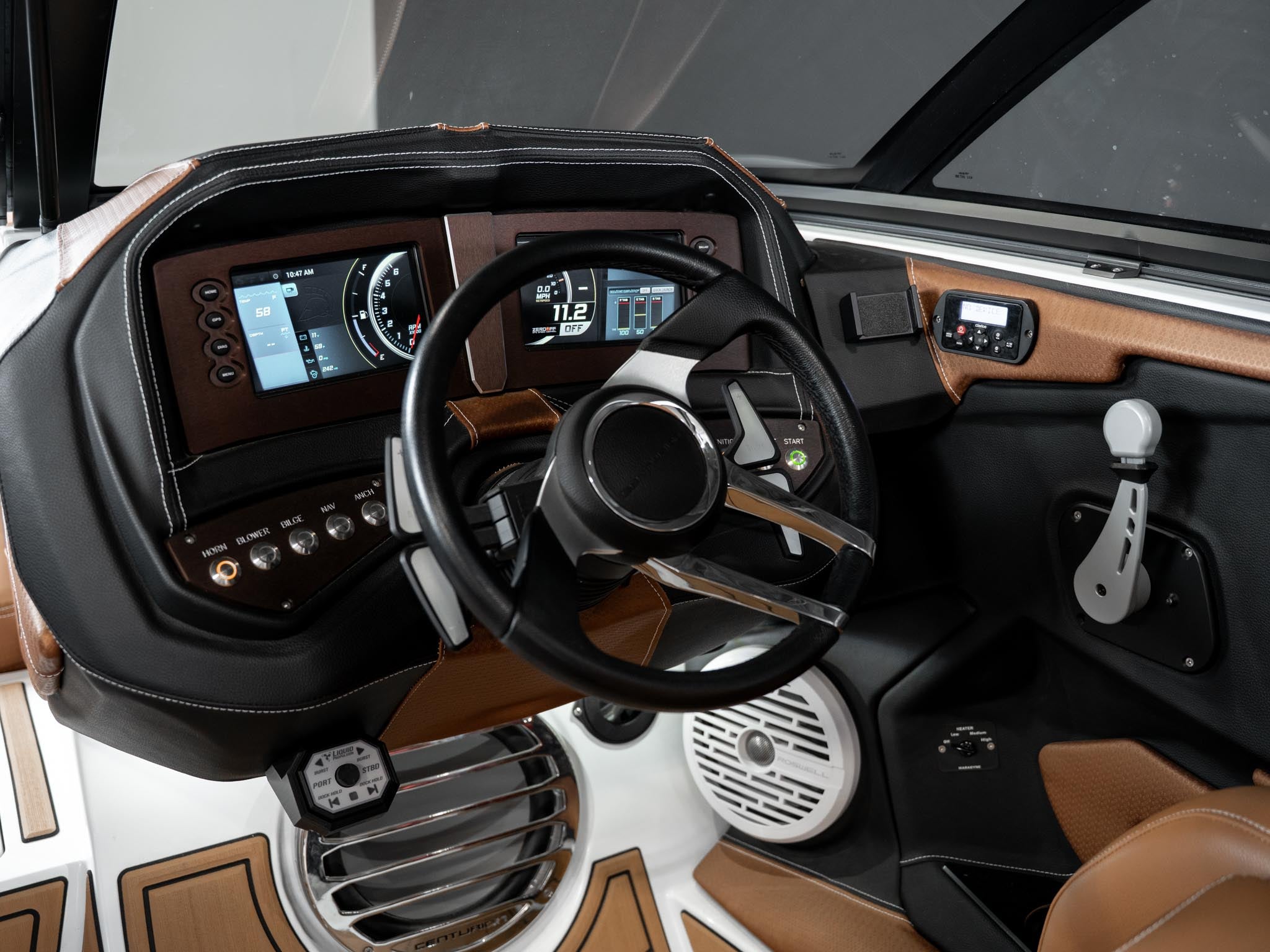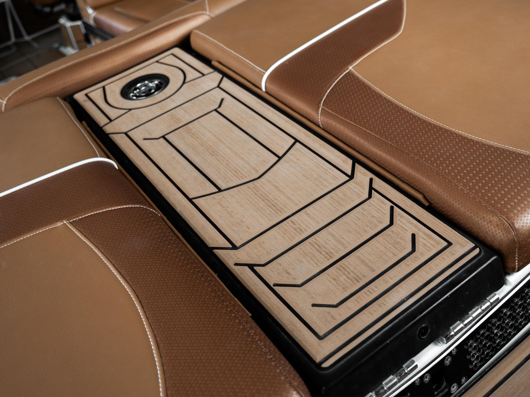 Inside, the Castano interior is a showstopper. Warm, premium brown tones with diamond stitching, embroidered panels, and high-end flooring give the boat a luxury automotive feel. The layout is deep, spacious, and designed to handle large crews without ever feeling crowded. Dual screens, premium audio, and high-end lighting make it feel modern and refined.