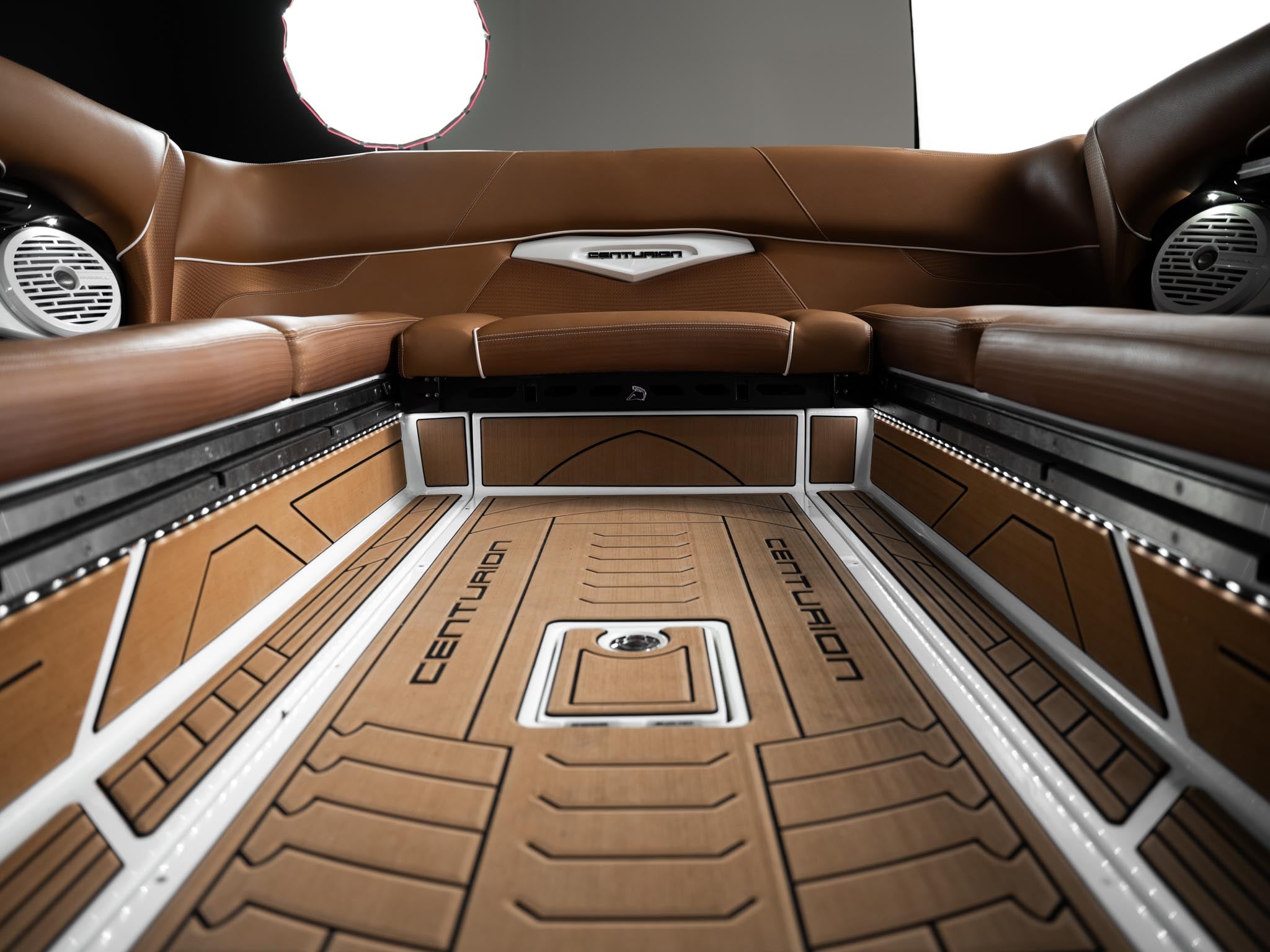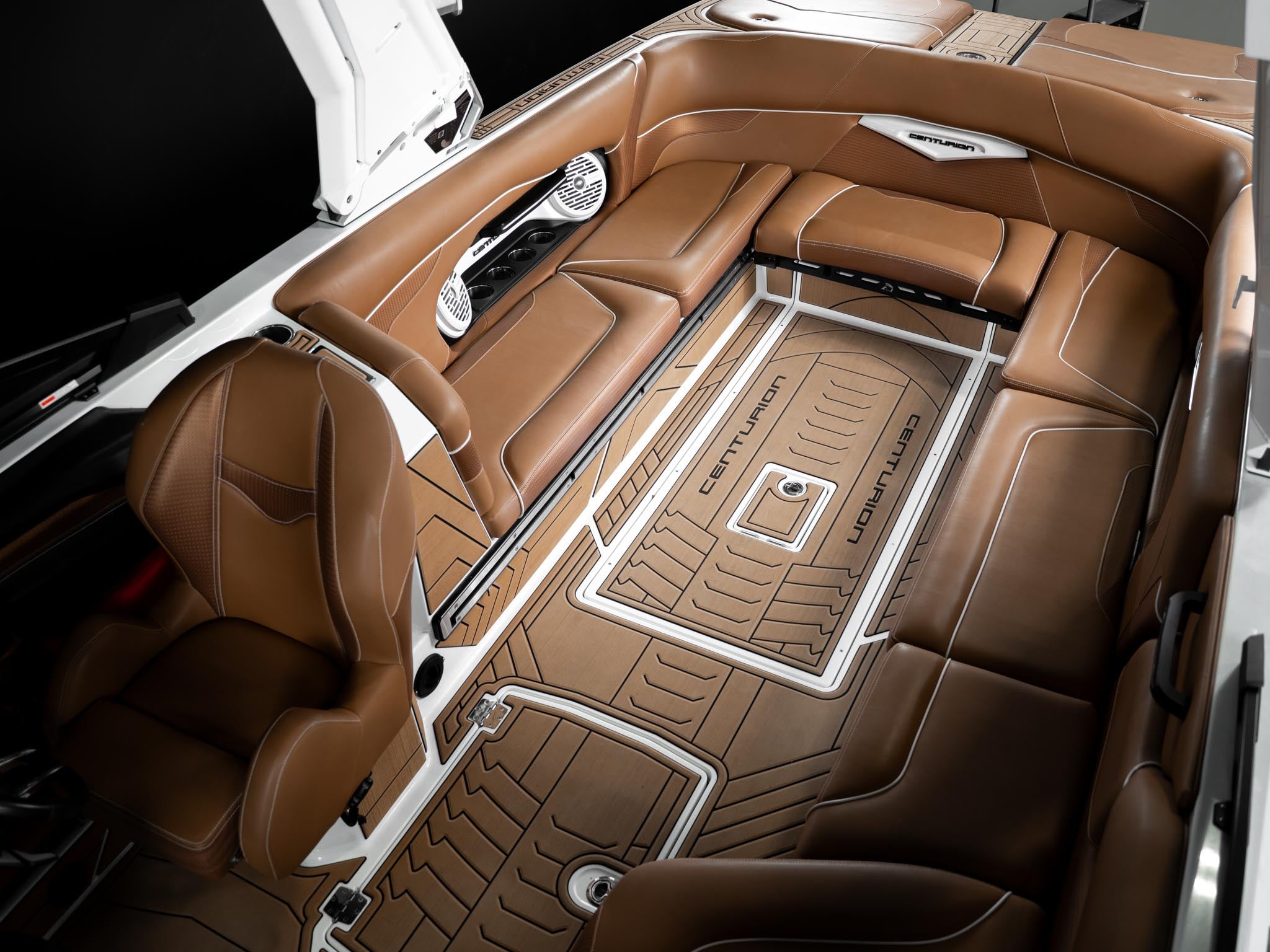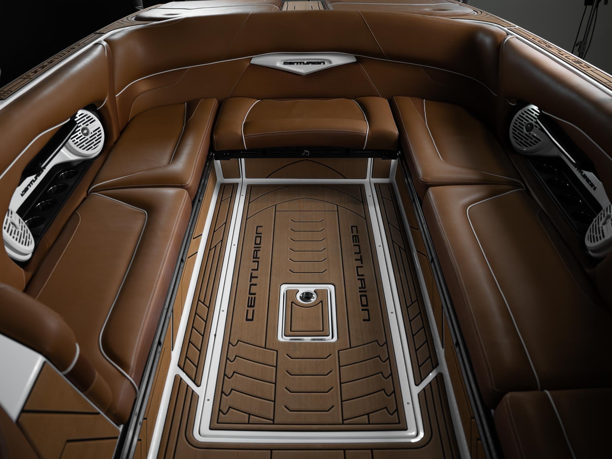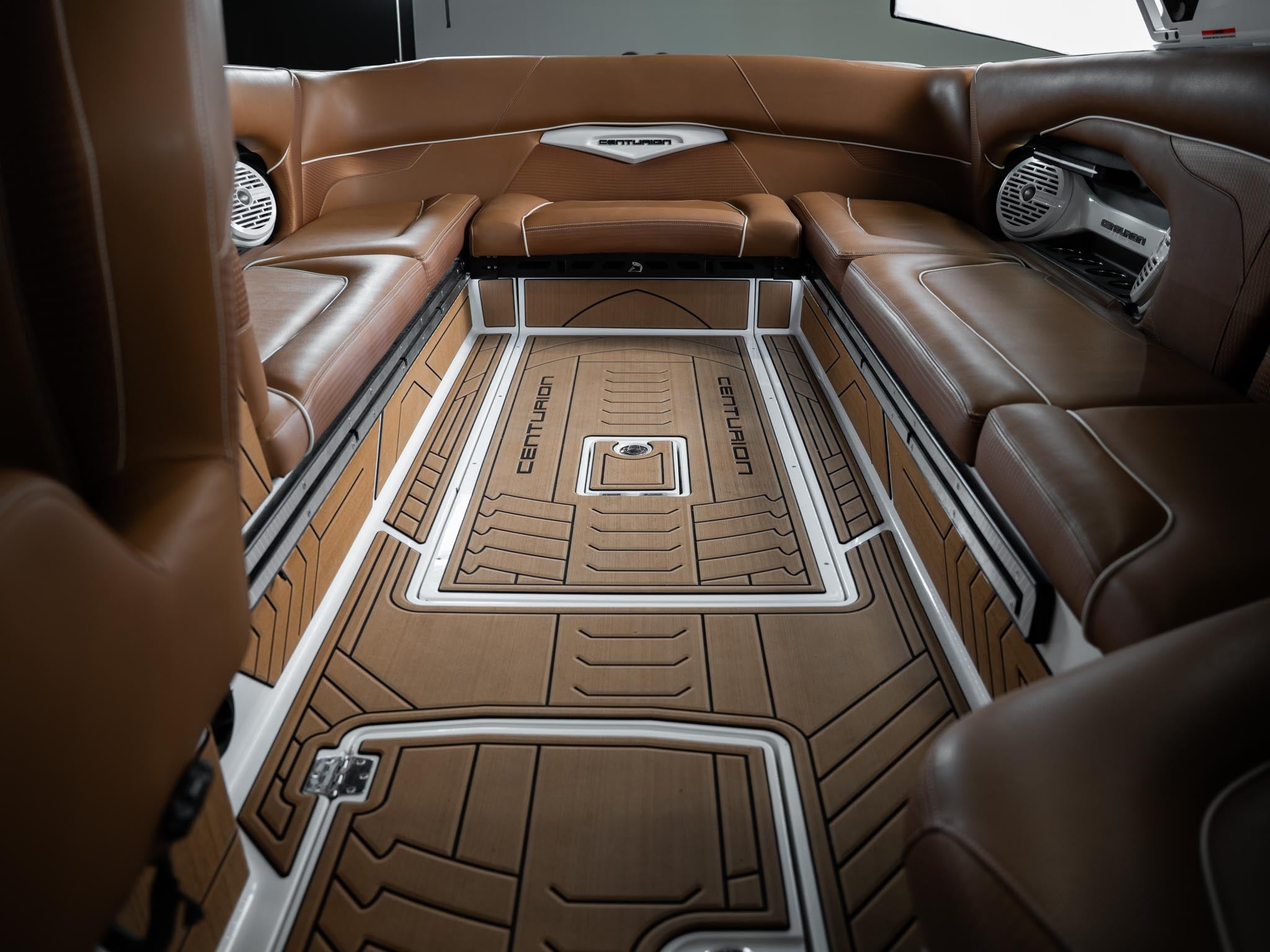 Inside, the Castano interior is a showstopper. Warm, premium brown tones with diamond stitching, embroidered panels, and high-end flooring give the boat a luxury automotive feel. The layout is deep, spacious, and designed to handle large crews without ever feeling crowded. Dual screens, premium audio, and high-end lighting make it feel modern and refined.