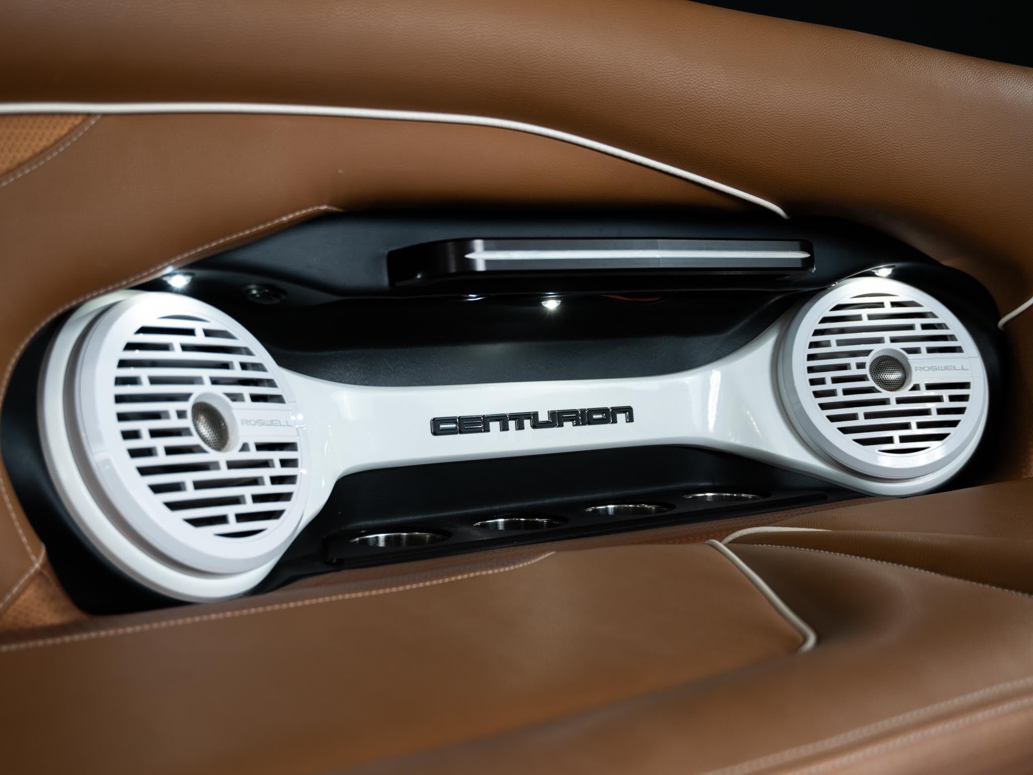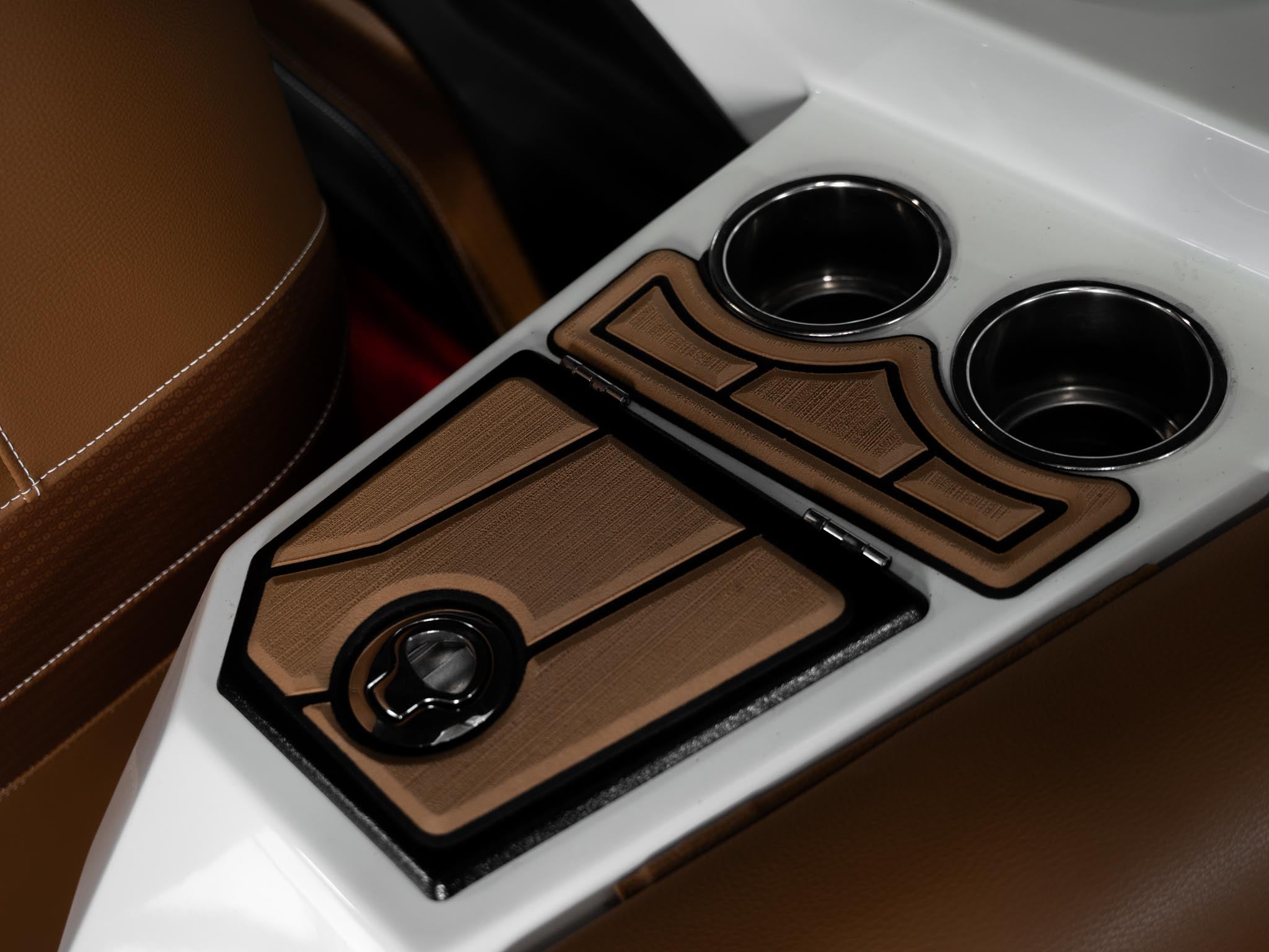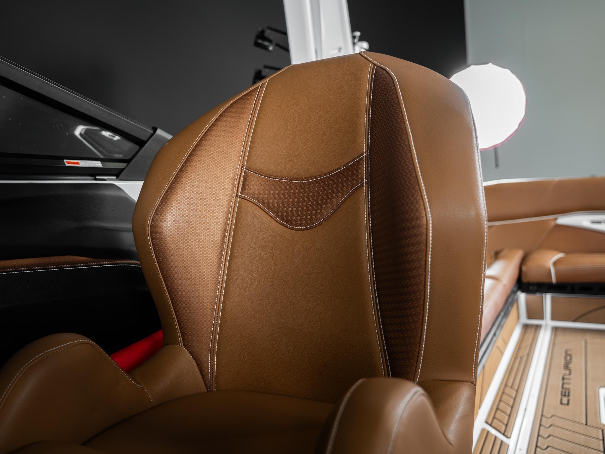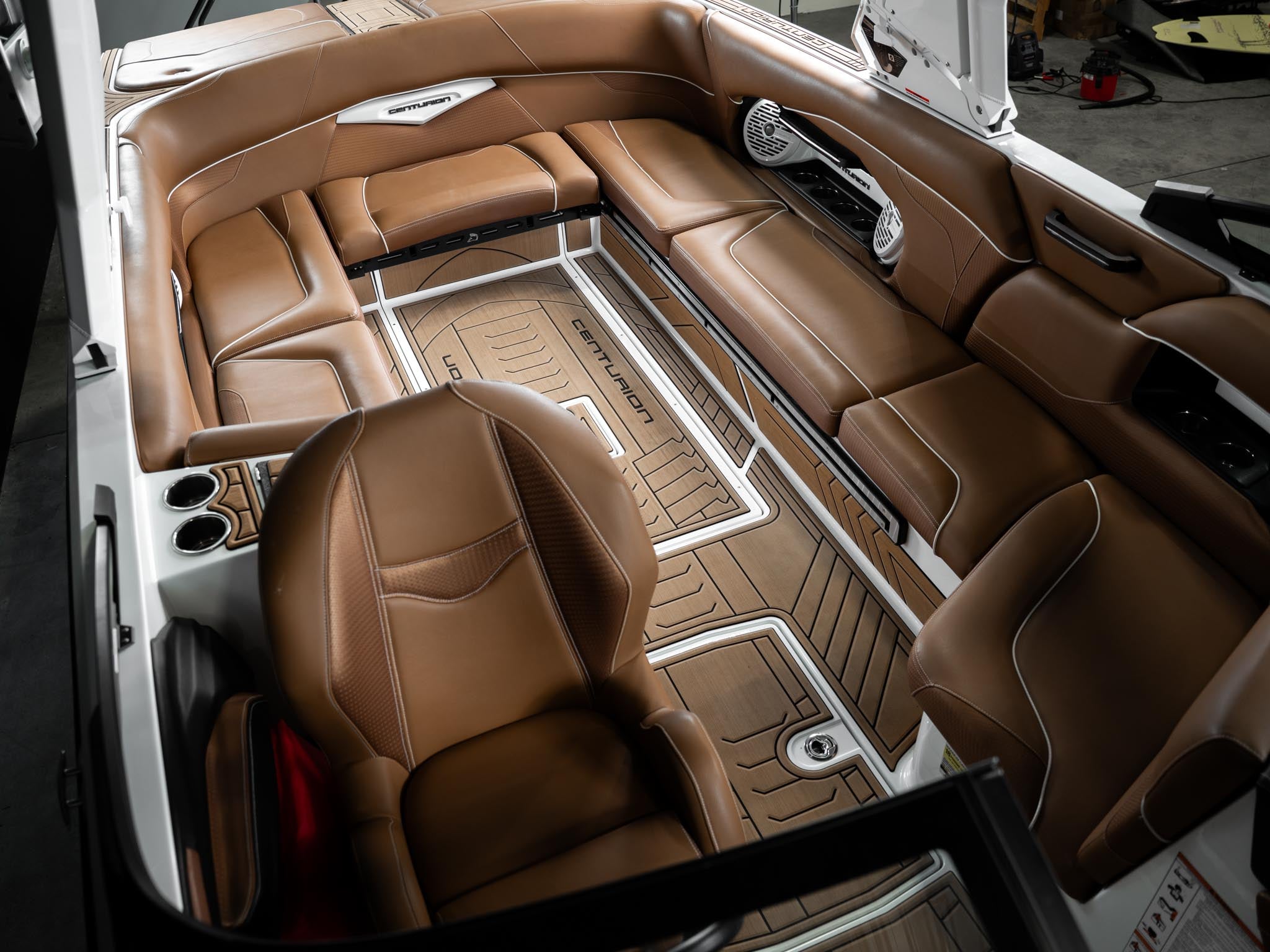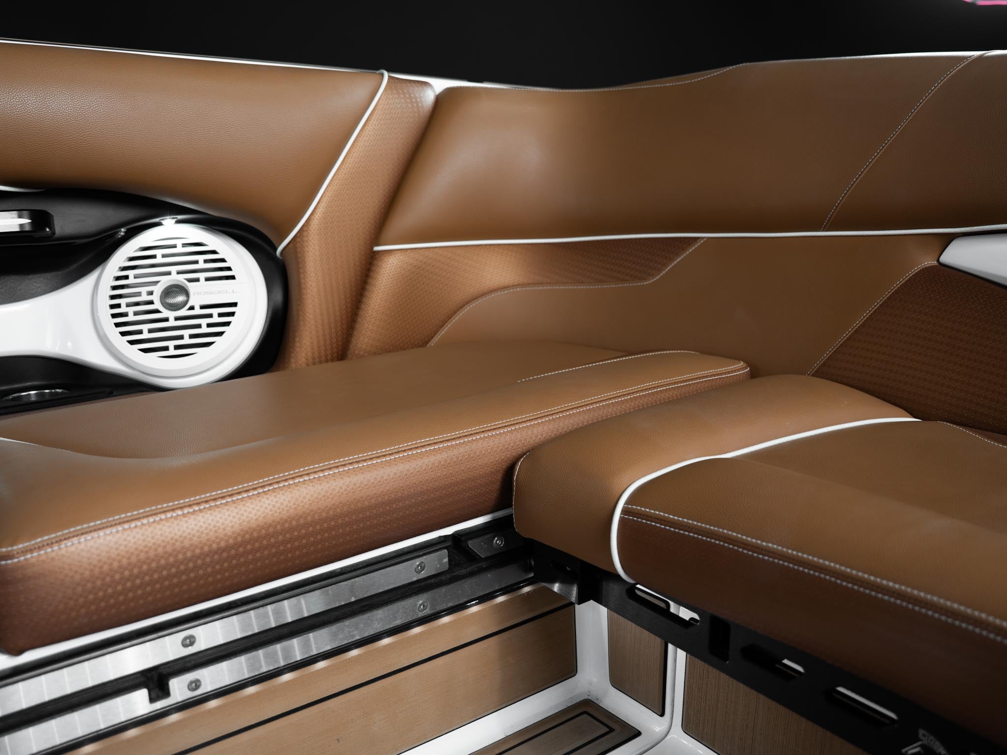 Inside, the Castano interior is a showstopper. Warm, premium brown tones with diamond stitching, embroidered panels, and high-end flooring give the boat a luxury automotive feel. The layout is deep, spacious, and designed to handle large crews without ever feeling crowded. Dual screens, premium audio, and high-end lighting make it feel modern and refined.